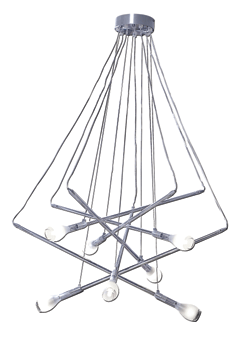 | memo: | Product Code 9670 - 1 Light H:1100 / D:650 9671 - 1 Light H:1600 / D:1200 Technical Description An entanglement of frosted lighting diffusers available in 1 and 7 light versions. The body and base are made in turned aluminium. A variety of lengths make it perfect for double volume installations. Colours Light Sources Type: G9 Halogen Bi-pin Watts: 7 x 25W Volts: 230V Base: G9 Technical Characteristics Protection: IP20 Insulation Class: Class I Resistance: Flammable |