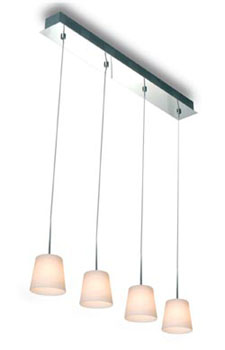 | memo: | Product Code 8733 Technical Description Surface mounted ceiling fitting with chrome metal base and four opal glass diffusers,which are attached to the base with a flexible metal suspension. Complete with transformer which is housed in the base of fitting.Suitable for indoor installation only. Colours 11 Chrome Light Sources Type:Halogen Watts:4 x 20W Volts: 12V Base: G4 Technical Characteristics Protection: IP20 Insulation Class: Class II Resistance: Flammable |